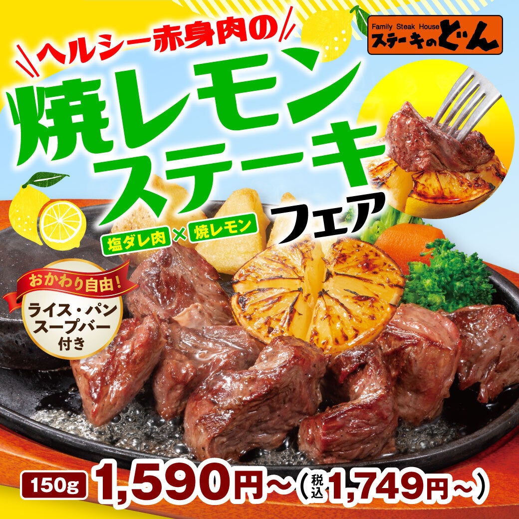 焼いたレモンに春を感じる爽やかメニュー!!『ヘルシー赤身肉の焼レモンステーキフェア』。「ステーキのどん」で2023年2月24日(金)から開始。