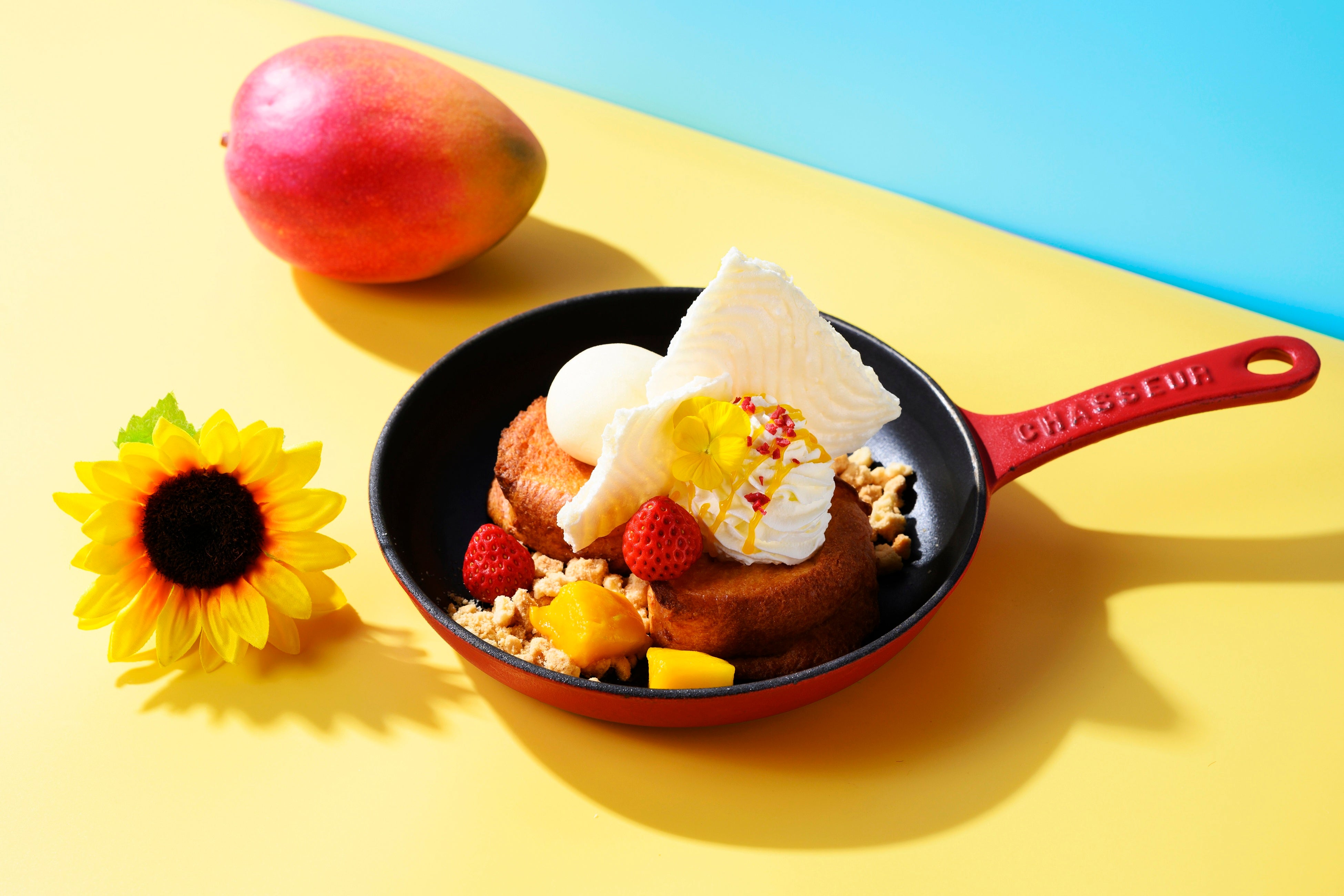 バニラアイスとベリー、夏のフルーツであるマンゴー、ほのかにアプリコットが香るマスカルポーネクリームを熱々のパンペルデュにトッピングしました。マンゴーソースが見た目にも爽やかでアクセントになっています。ココナッツが香るサクサクのメレンゲを添えました。デザートとしても優雅なブランチとしてもお召し上がりいただきたい一品です。
