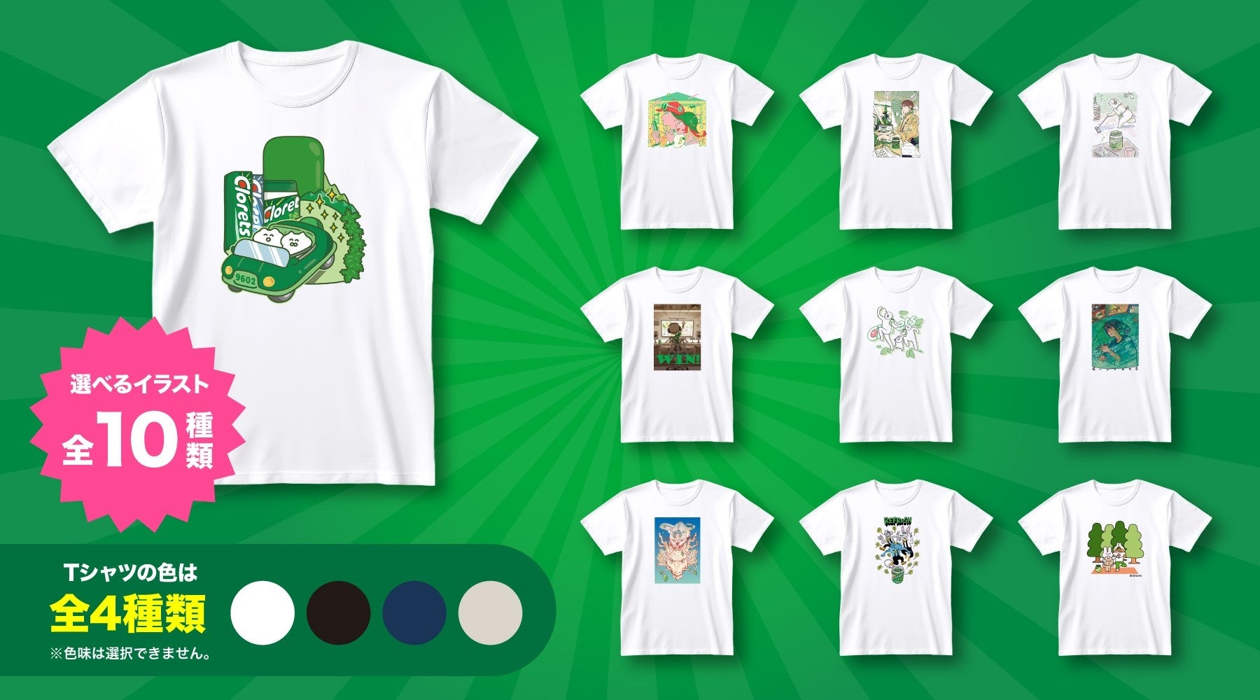 本キャンペーンは、人気イラストレーター10名とコラボレーションし、クロレッツの「リフレッシュ」をテーマに描いた計40種類のオリジナルTシャツを1,000名様に抽選でプレゼントいたします。クロレッツ製品500円(税込)購入レシートでキャンペーンページより応募が可能です。