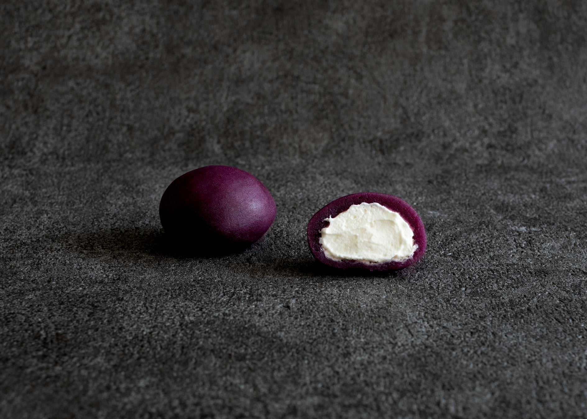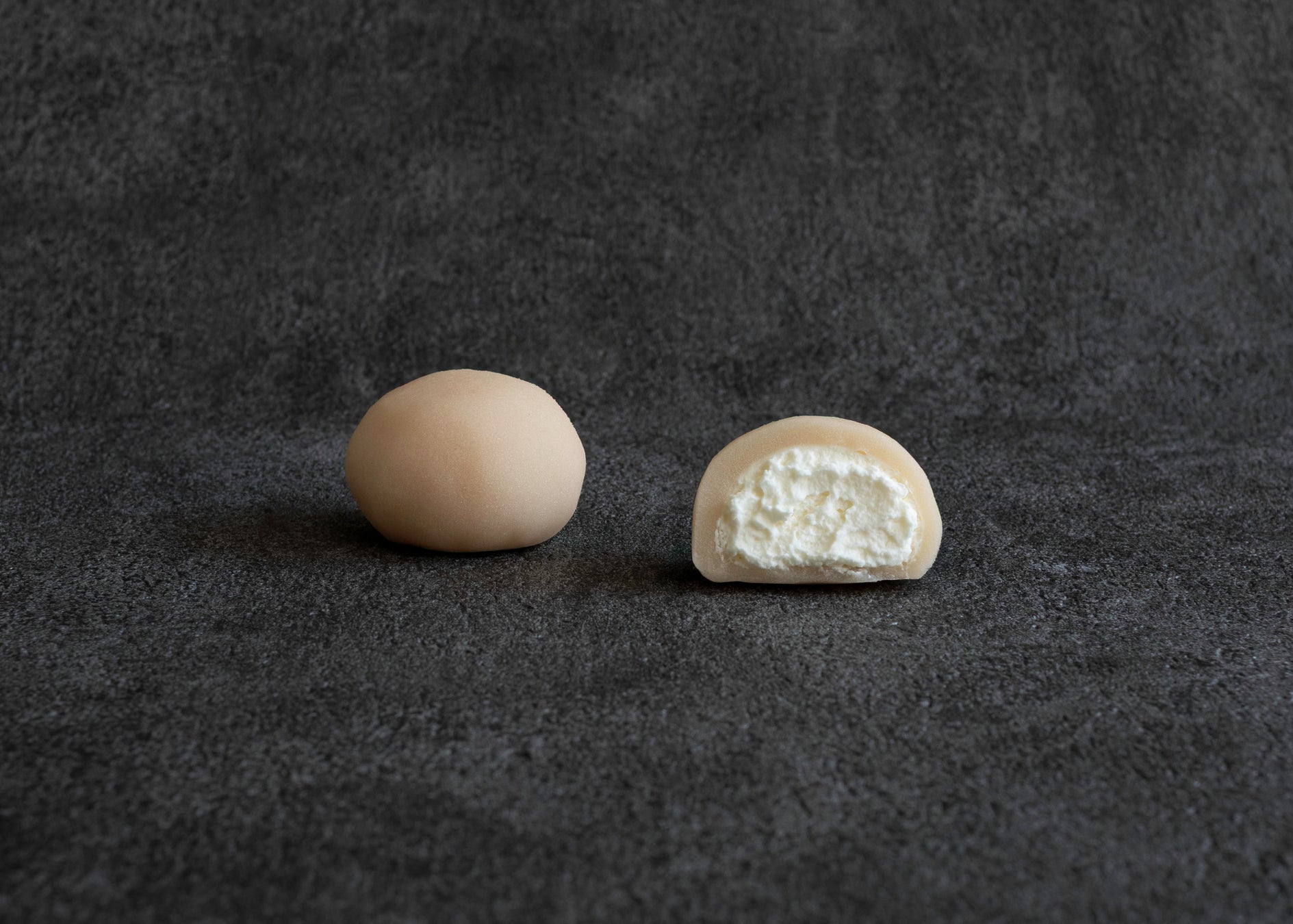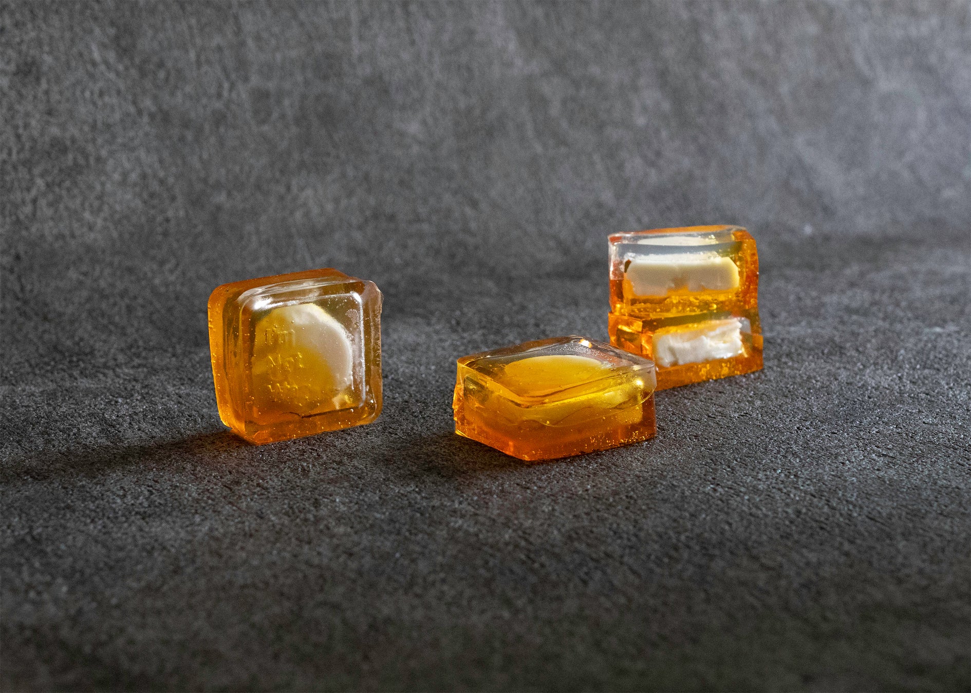 ガラスのように透き通る錦玉羹のシェルの内部に、塩味を帯びたクリームチーズを挟み込む。