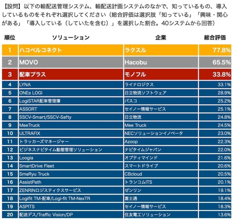 「ハコベルコネクト」がLOGISTICS TODAY実施の「輸配送管理・計画システムの『知名度・関心・実績』総合ランキング」で認知度No.1を獲得