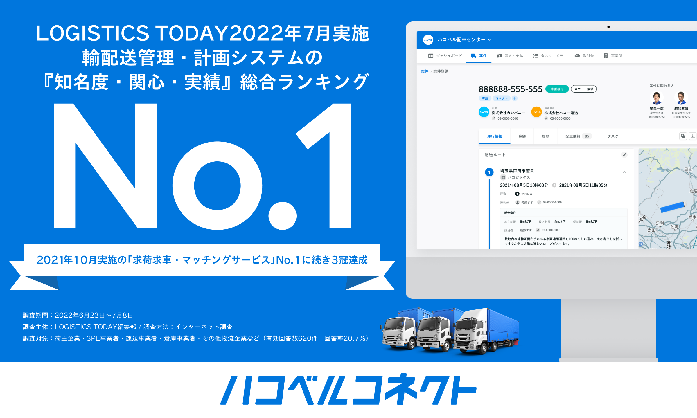 今回、物流ニュースサイト「LOGISTICS TODAY」において発表された「輸配送管理・計画システムの『知名度・関心・実績』総合ランキング」で輸配送管理・計画システムの40事業者中、当社システム「ハコベルコネクト」が認知度No.1を獲得しました。これは、「LOGISTICS TODAY」が2021年7月に実施した「配車計画システム関心度ランキングTOP40」と2021年10月に実施した「求荷求車・マッチング認知度ランキング」に続き、3冠となっております。