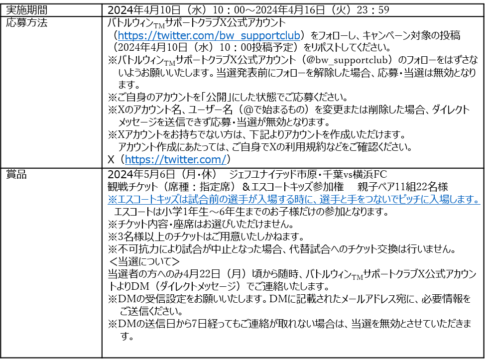 開催を記念して4月10日(水)より「バトルウィン(TM)サポートクラブ」公式X(旧Twitter)にて、小学生を対象にしたエスコートキッズ参加権と親子ペアチケットが抽選で11組22名様に当たるプレゼントキャンペーンを実施します。