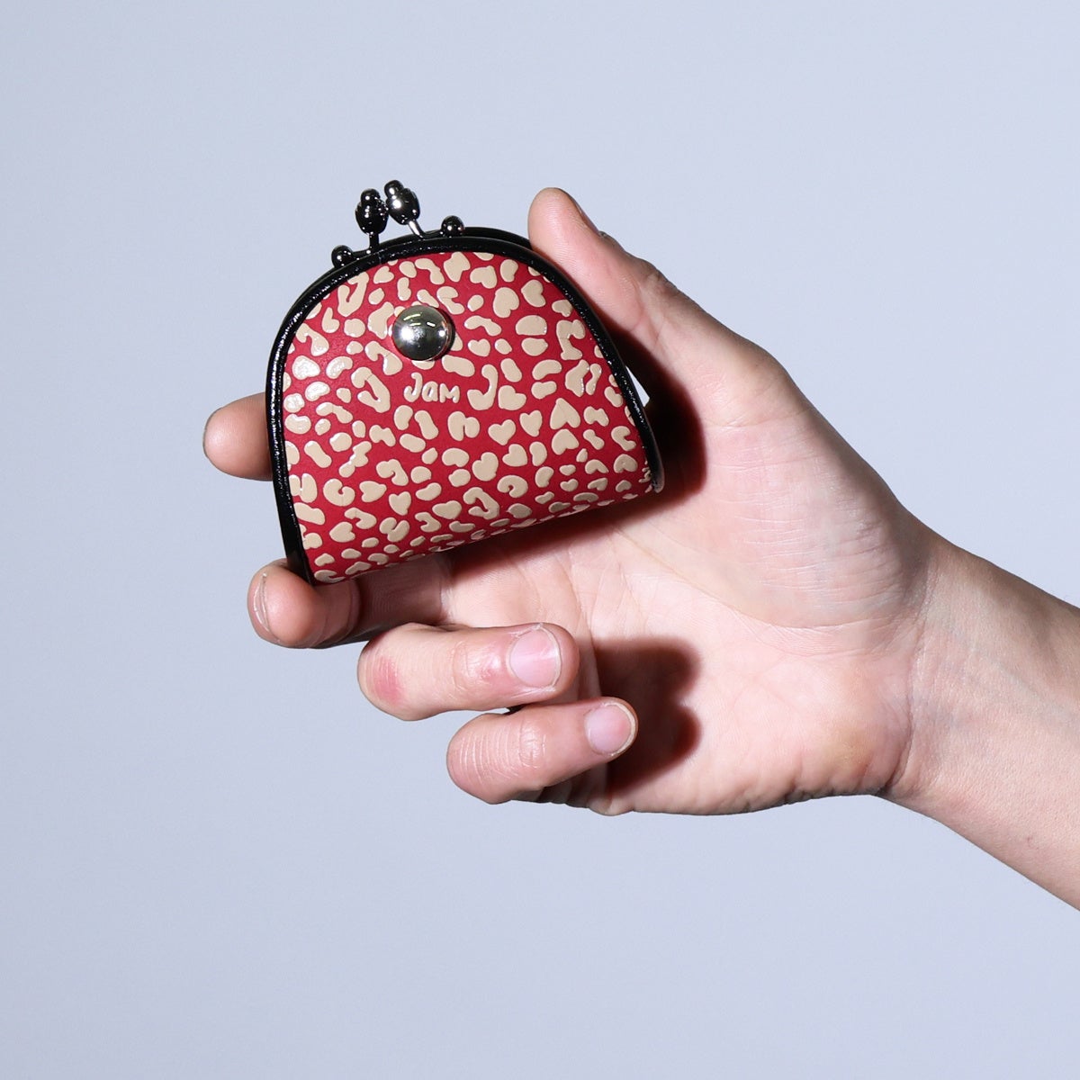 JAM HOME MADEのオリジナル柄は、全部で5種類。JAM1号店の内装に着想した「ANECHOIC(無響室)柄」、ALVA NOTO の活動名で知られるカールステン・ニコライと協業した伝説的な空間を起点とするパターン。2つ目の柄は、最初期に人気を博したパンチング加工を印伝で再解釈した「DOT(ドット)柄」、3つ目の柄は、ジャム瓶のチェックと千駄ヶ谷に根ざした将棋盤を掛け合わせた「GINJAMCHECK(ギンジャムチェック)柄」、4つ目の柄は、JAM=押しつぶす。という思想から生まれた、何層にも重ねたマテリアルの実験「JAMNIMAL(レオパード)柄」、5つ目の柄は、これまでの柄をパッチワーク状に再構成し、印伝発祥の地・山梨県の形状を忍ばせた「CAMOUFLAGE(カモフラージュ)柄」。その中から今回の新作に抜擢したのは、老若男女から人気の高い「JAMNIMAL(レオパード)柄」。