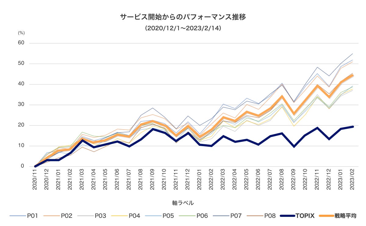 Wealth Wingが提供する8つの戦略のうち、サービス開始から今月時点で全ての戦略がTOPIXを大幅に上回るトラックレコードを記録しています。