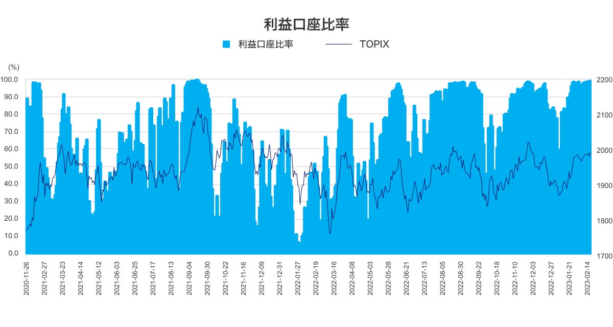 サービス開始当初、TOPIX(東証株価指数)の下落とともに利益口座比率は下がっていますが、直近の2022年末の下落においては大きくは下がらず、高水準を維持しています(※2)。