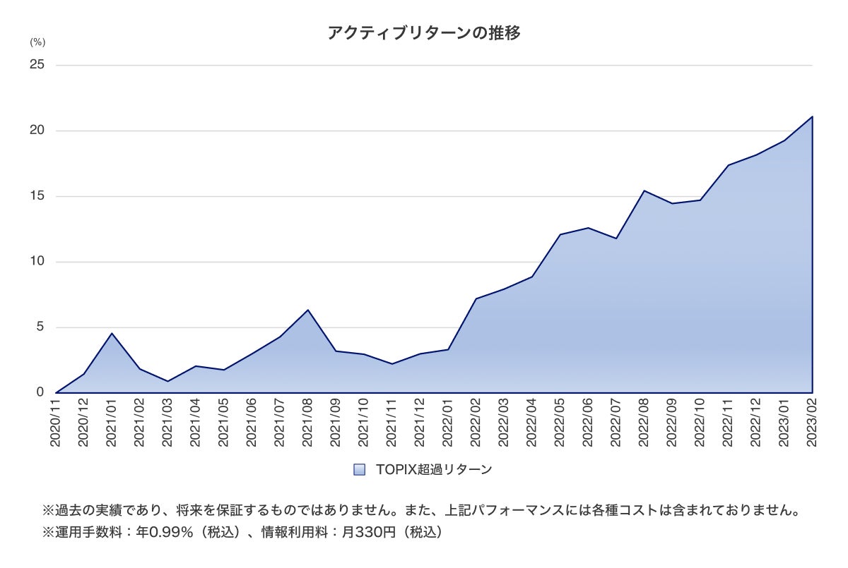 また、TOPIXの変動を差し引いた超過分となるアクティブリターンについても右肩上がりに推移しています。特に不安定であった2022年でも堅調に推移しております。