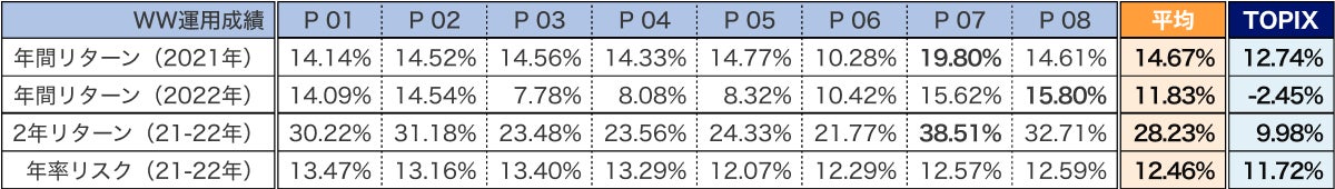 2021〜2022年の年率リスクはTOPIXと同程度(TOPIX:11.72%、Wealth Wing:12.46%)でしたが、市場が堅調であった2021年でも年間リターンはTOPIXを上回る結果となりました。また、市場が不安定となった2022年では、TOPIXのリターンが-2.45%に対し、Wealth Wingは+11.83%と市場が下落したにも関わらず大幅なリターンを記録しました。