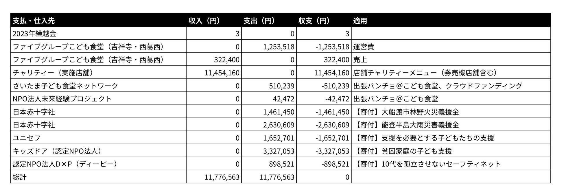 「"楽しい"でつながる世界をつくる」飲食企業である株式会社ファイブグループ(本社:東京都武蔵野市、代表取締役社長:坂本憲史、以下 ファイブグループ)は、運営する各飲食店にて「チャリティーメニュー」を設置し、これを原資として、お客様と共に地域への貢献活動を実施しています。2024年はチャリティーメニューを通じて年間1,000万円を超える活動へのご支援をいただき、子ども食堂活動の他、江ノ島でのビーチクリーン、各種寄付も含め、1年間で合計20回の地域貢献活動を実施することができました。