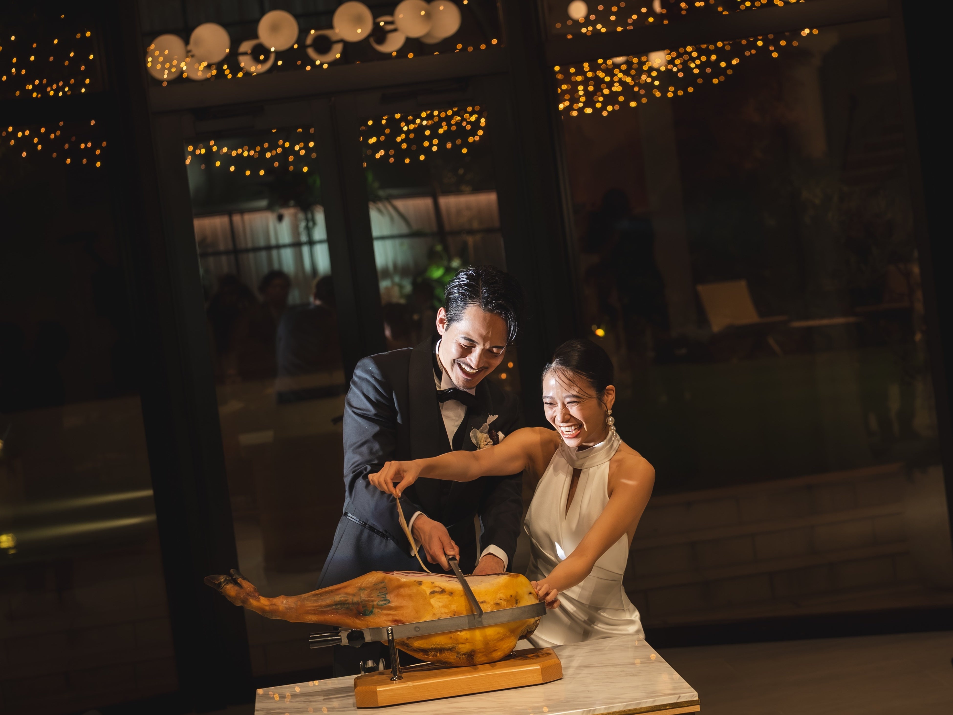 結婚式では、初めての共同作業として定番の演出である「ケーキ入刀」にについて、当初おふたりは前向きではなく、もっと自分たちらしい、楽しい演出をしたいと希望されていました。ケーキ入刀の代わりに、番組内での象徴的なシーンを彷彿とさせる演出ができないかと考えたウェディングプランナーは、食べることが大好きなおふたりの旅で何度も登場した「生ハム」への入刀をご提案しました。
