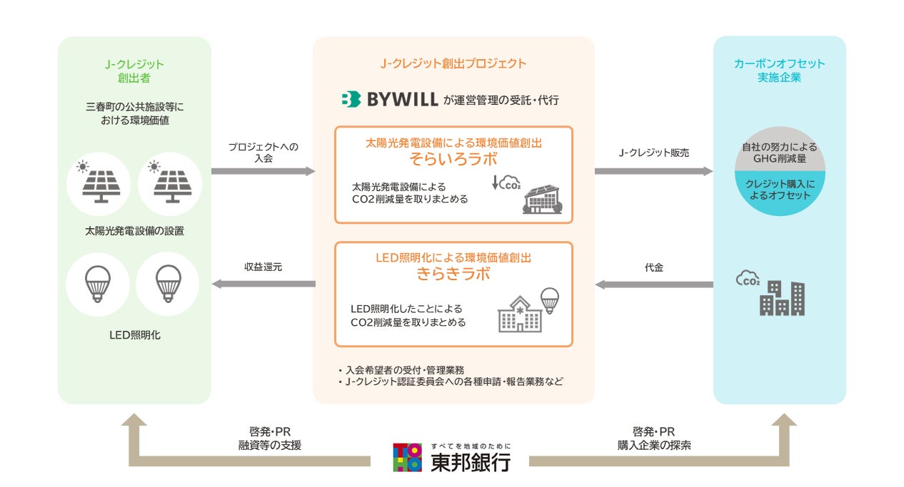バイウィルは、三春町におけるJ-クレジット創出プロジェクトの登録・申請からモニタリング、創出したクレジットの販売までをシームレスに支援します。また、販売に関しては、東邦銀行とも協力し、「地産地消」によって三春町をはじめとする地域の脱炭素化を促進します。