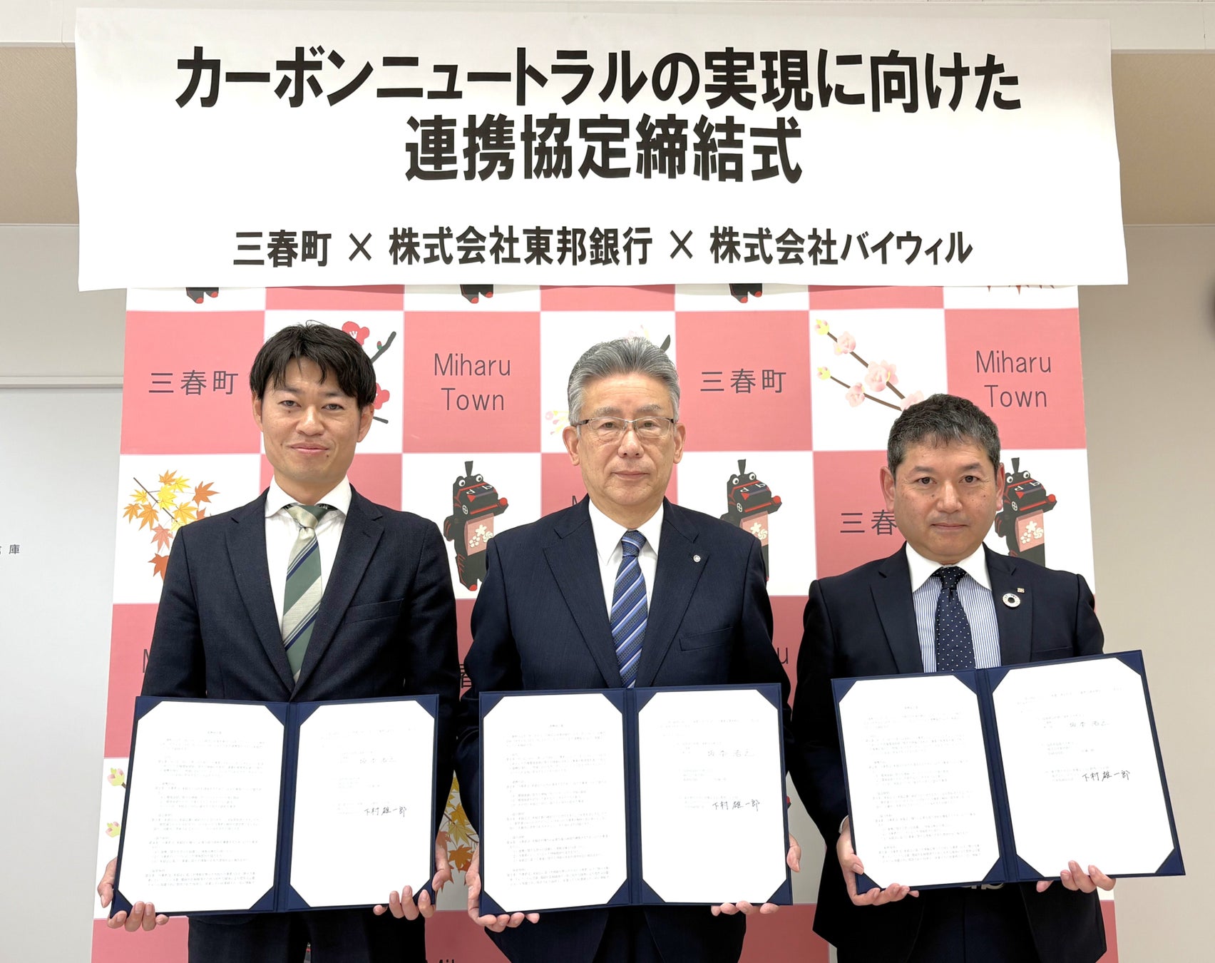 日本全国47都道府県のカーボンニュートラル実現を目指す株式会社バイウィル(本社:東京都中央区、代表取締役社長:下村 雄一郎、以下「バイウィル」)は、福島県田村郡三春町(町長:坂本 浩之、以下「三春町」)と、株式会社東邦銀行(本店:福島県福島市、取締役頭取:佐藤 稔、以下「東邦銀行」)と三春町のカーボンニュートラル及びサーキュラーエコノミー実現に向けた連携協定を締結しました。