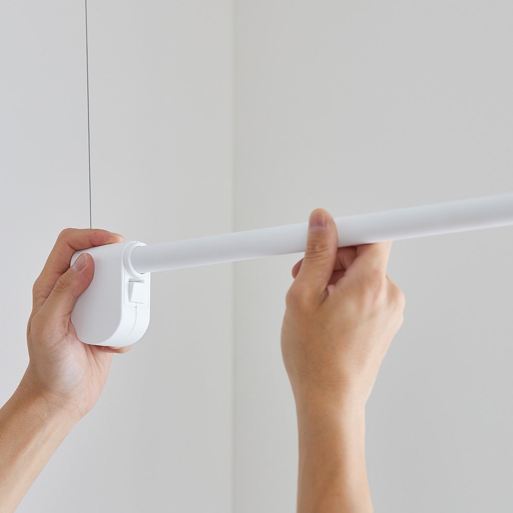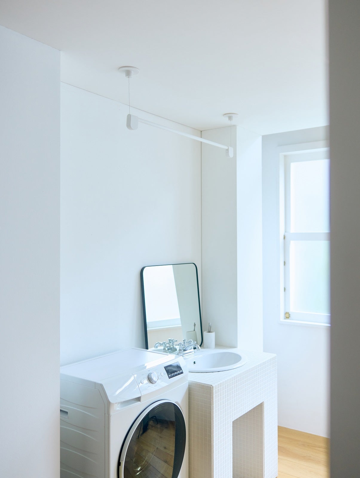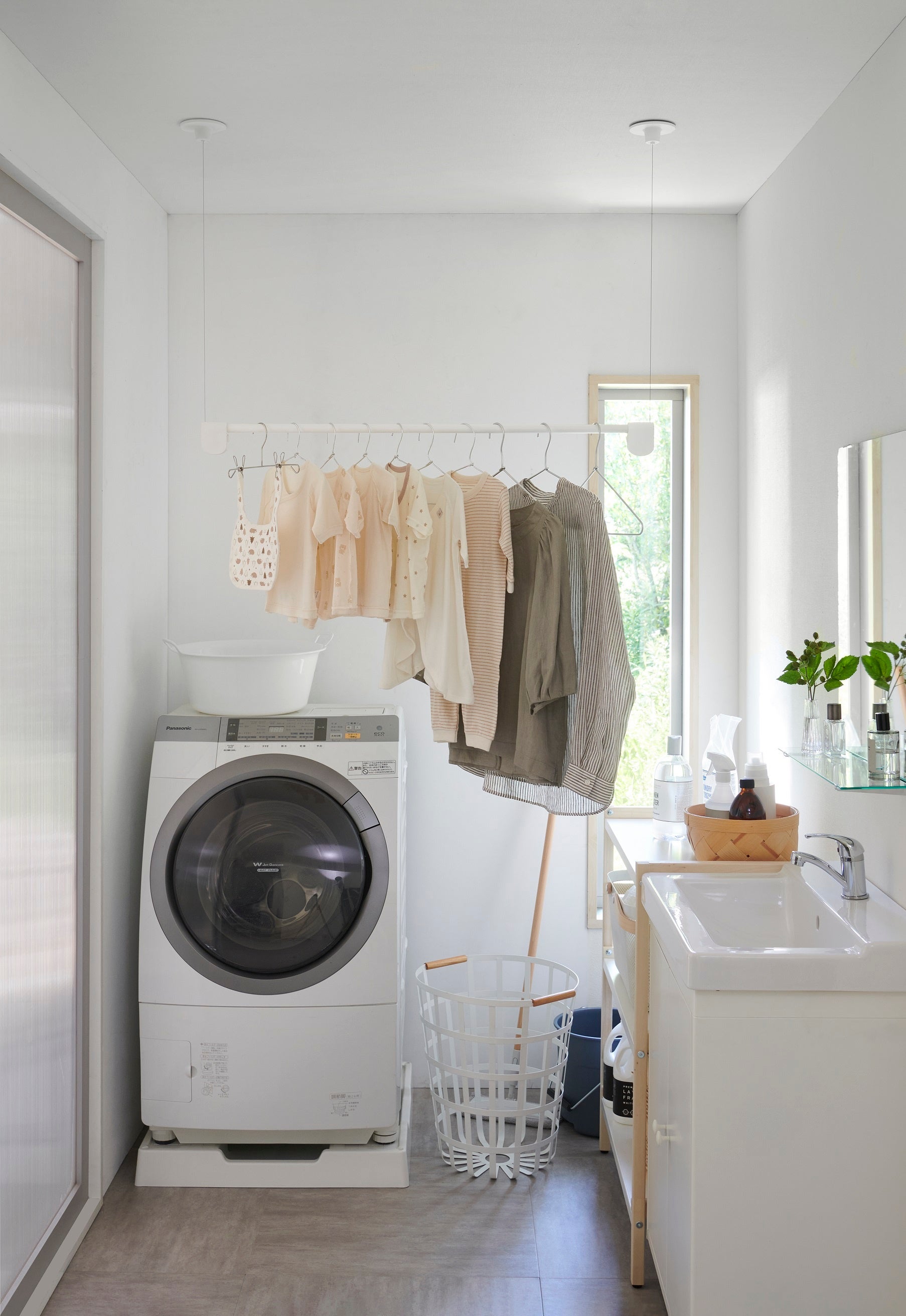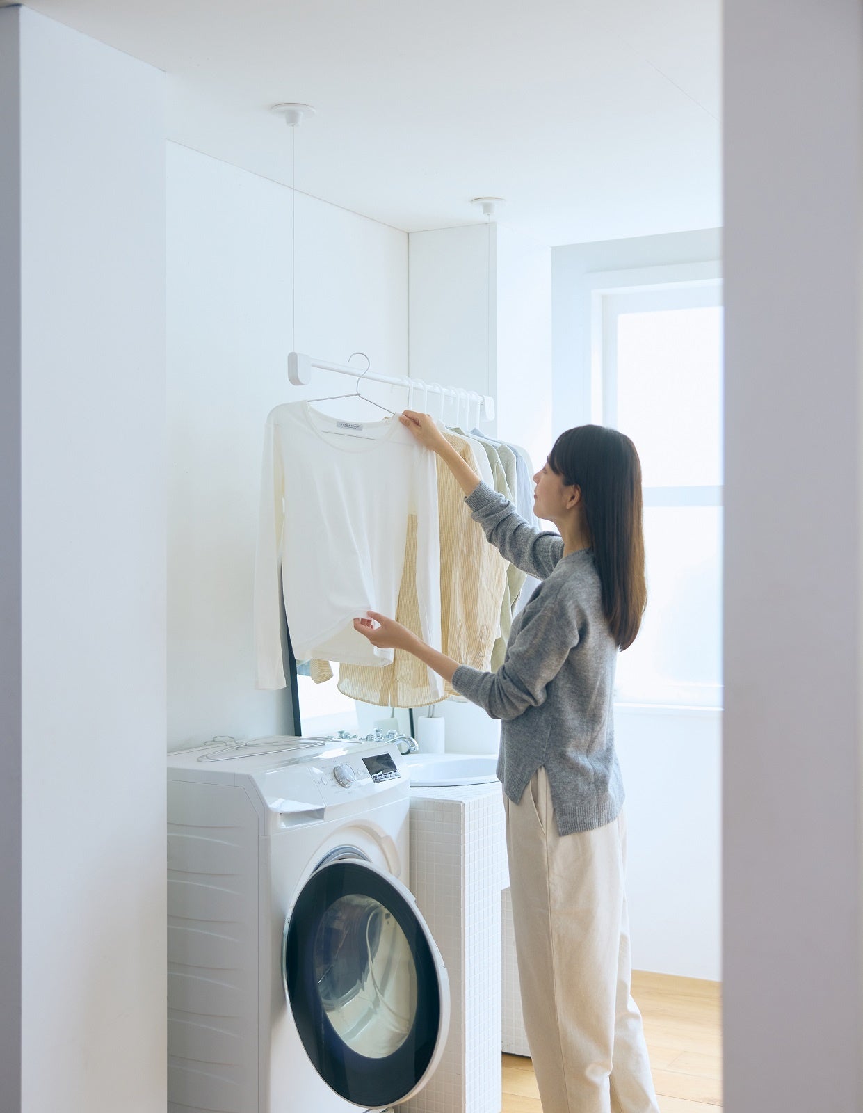 今回、新発売する「天井付け物干し」は、「壁付けタイプは、設置できるスペースがない」というお客様の声から生まれました。天井の空いているスペースを使い、好きな場所に物干しを簡単に設置できる商品です。洗濯機の近くに設置すれば、既存の空間を「ランドリールーム」として活用することができるので、作業動線がスムーズになり時短に繋がるため、共働き世帯や子育て世帯にオススメです。また、お部屋に馴染む圧迫感のないデザインで、リビングや寝室などの空間にも、お部屋のコーディネートを邪魔することなく取り入れることができます。