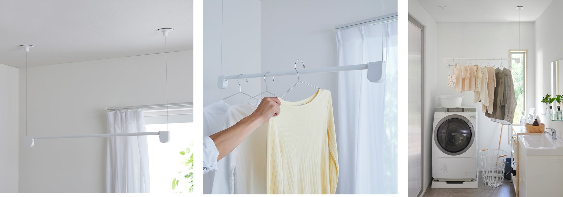 【ベルメゾンが提案する"浮かせて干す"「エア干し」シリーズ!天井の空きスペースを有効活用できる「天井付け物干し」を新たに開発】