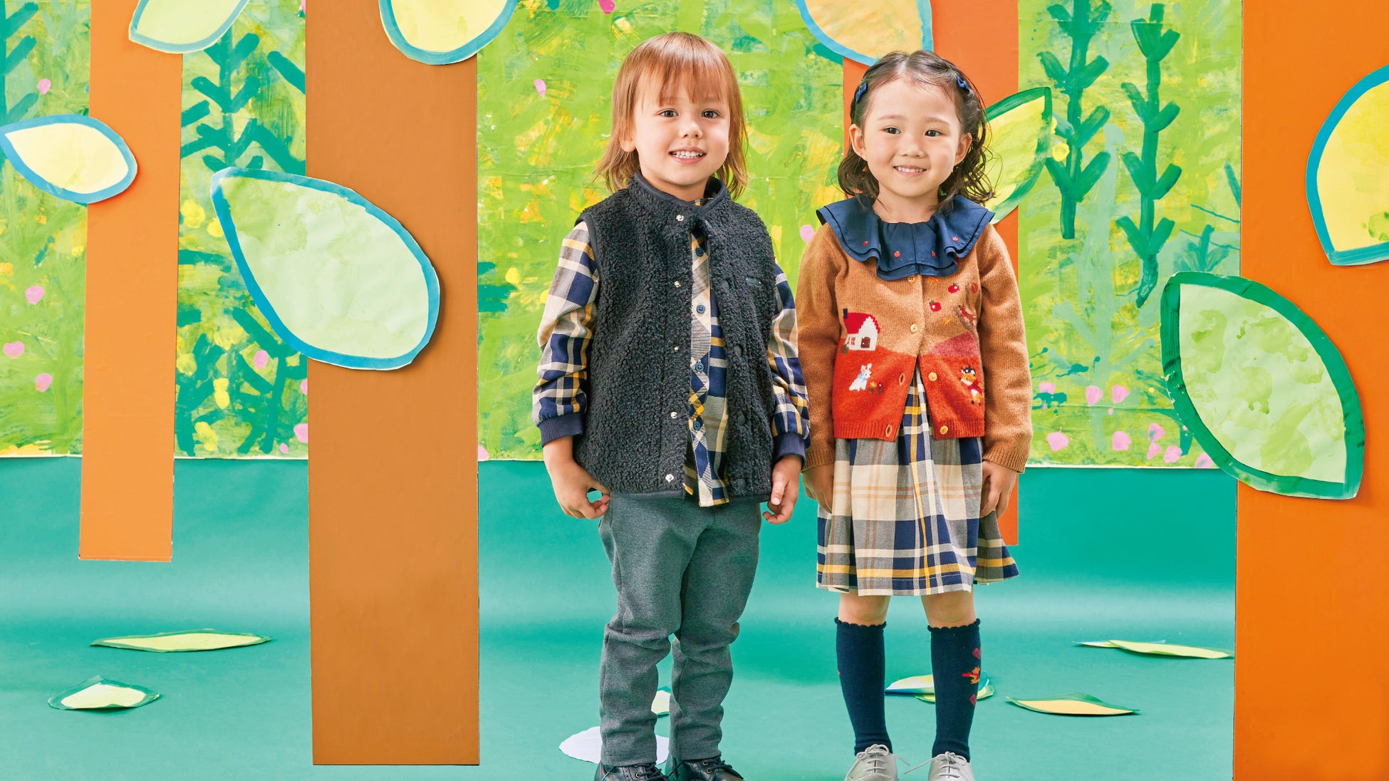 9月は「Color In Nature」をテーマに、デイヴィッド・ホックニーからインスピレーションを受けた、自然や森に住む動物に注目したアイテムを展開します。オーガニックの糸を使用した秋らしい色合いのオリジナルチェックを80cm~160cmのスタイルに共通して使用。秋のおでかけにぴったりのスタイルをお楽しみください。