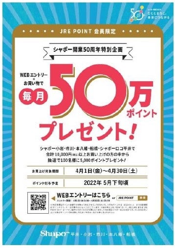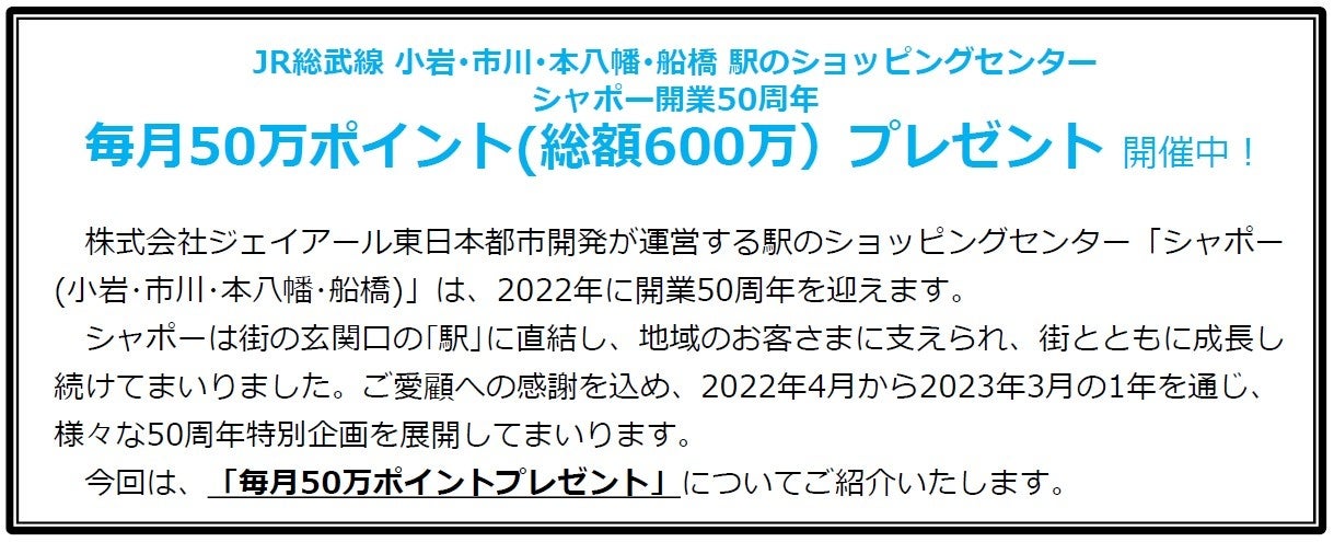 JR総武線 小岩、市川、本八幡、船橋駅のショッピングセンター シャポー開業50周年 毎月50万ポイント(総額600万)プレゼント 開催中!