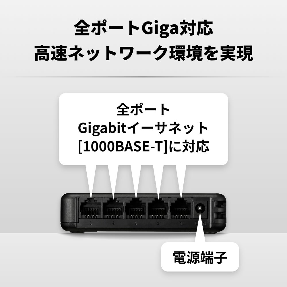 本商品は、全ポートが高速転送を実現するGiga(1000BASE-T)に対応したスイッチングハブです。動画などの大容量データの通信も快適なネットワーク環境が構築できるので、ご家庭のWi-FiルーターのLANポートを増やしてゲーム機やテレビ、BDレコーダー等をインターネットに有線接続したい方におすすめします。