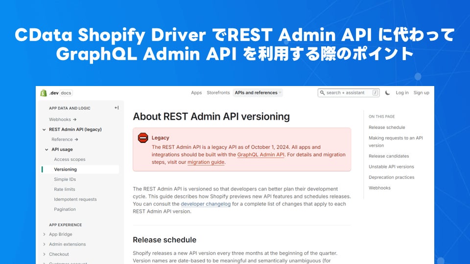 Shopify の出店事業者が利用する注文や商品といった管理データにアクセスが可能なAPI は現在「REST Admin API」と「GraphQL Admin API」の2種類があります。REST Admin API は古くから提供されていたため今でも多くのユーザーが利用していますが、GraphQL Admin API がリリースされてからはこちらをメインとして利用するようShopify から推奨されていました。そして昨年2024年10月1日をもってREST Admin API はレガシーAPI というステータスとなり、現時点ではユーザーはREST Admin API を引き続き使用することができるものの、マイグレーションが推奨される状況になりました。CData Shopify Driver では以前よりREST Admin API だけでなく、GraphQL Admin API のサポートも行っており、引き続きどちらも利用が可能です。