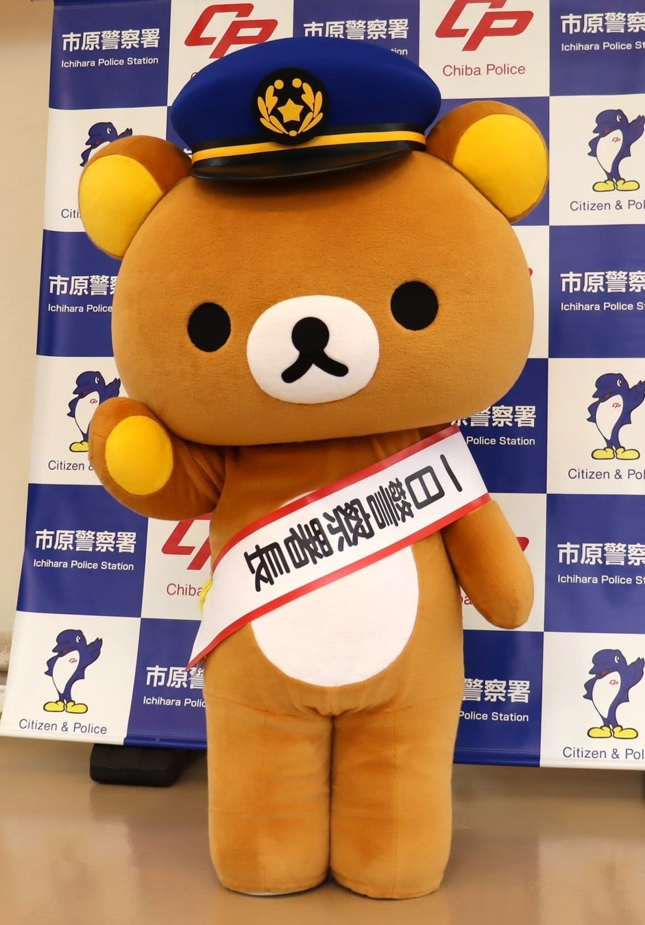 リラックマは、市原警察署一日署長委嘱式にて委嘱状を受け取ると、警察帽子をかぶった姿で写真撮影に応じ、訪れた方に交通安全を呼びかけました。