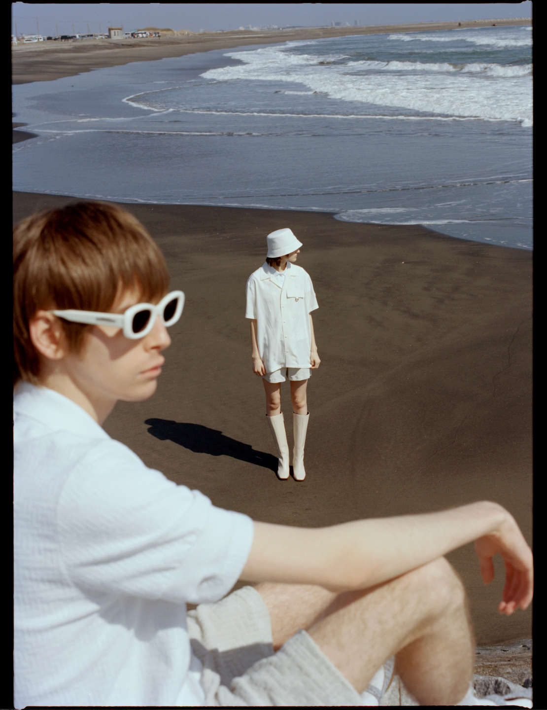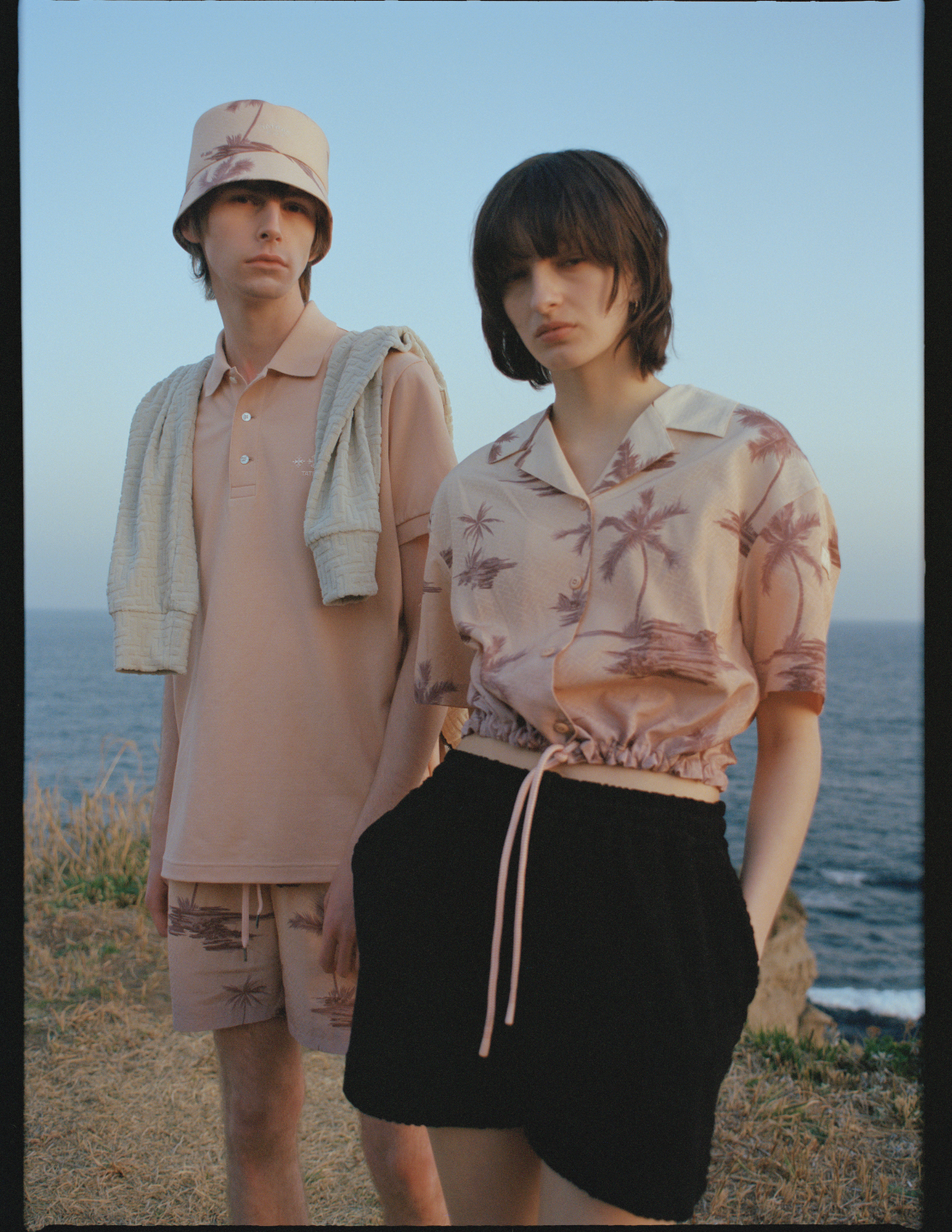 今回のコレクションの象徴となるサンセットからインスパイアされたアイテムは、⼣⽇に照らされる