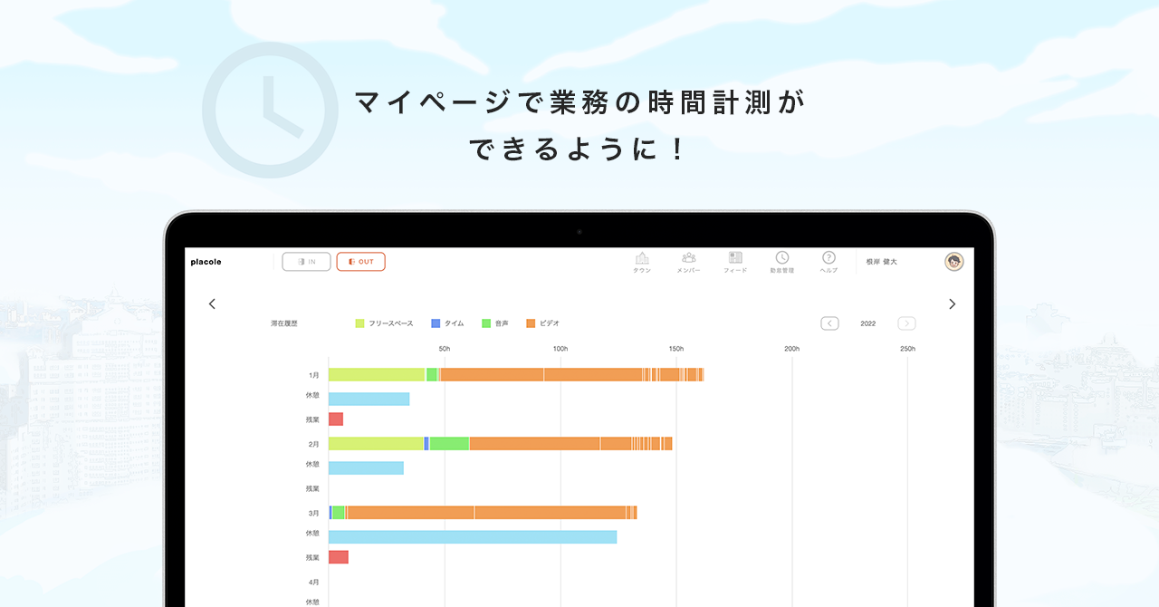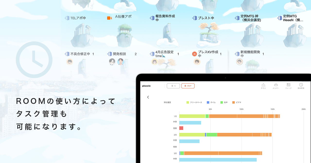 各Roomの滞在時間や、休憩時間、残業時間をグラフで閲覧できるように。