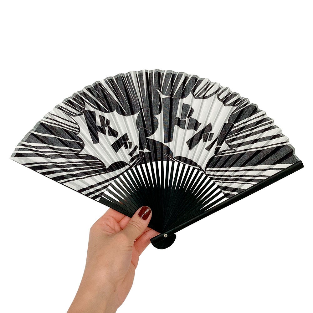 漫画でよく目にする、シーンを盛り上げる「ドオオォォン」「ドンッ!ドンッ!」といった効果音。さらに登場人物を目立たせるための「集中線」を組み合わせて、漫画の1コマを切り取ったようなインパクトのある扇子をデザイン。
