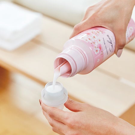 ふんわりやさしい桜の香りに包まれる植物由来柔軟成分配合のファブリックソフナー。