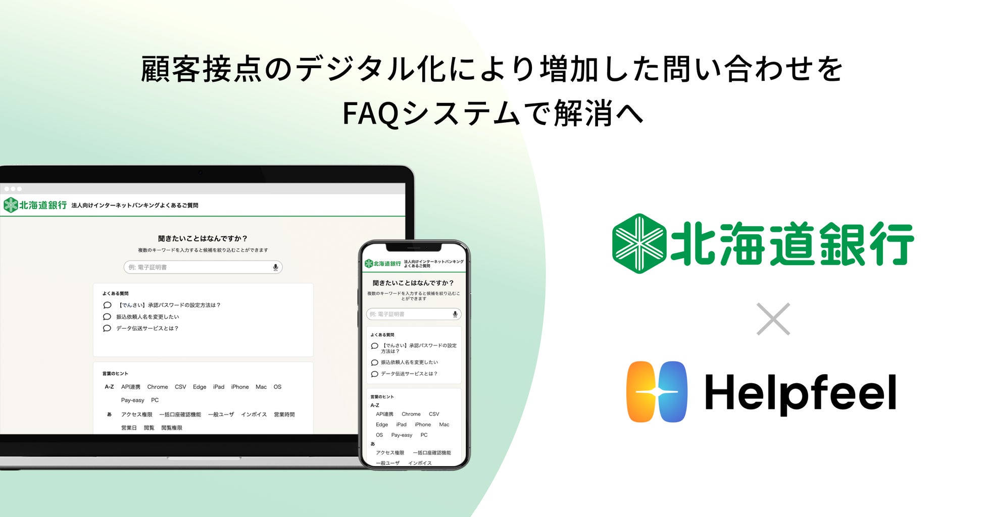 株式会社Helpfeel(京都府京都市、代表取締役/CEO:洛西 一周、以下 当社)は、株式会社北海道銀行(北海道札幌市、代表取締役頭取:兼間 祐二、以下 北海道銀行)の法人向けインターネットバンキングサービスサイトに検索SaaS「Helpfeel(ヘルプフィール: https://helpfeel.com/ )」を導入いただいたことをお知らせいたします。