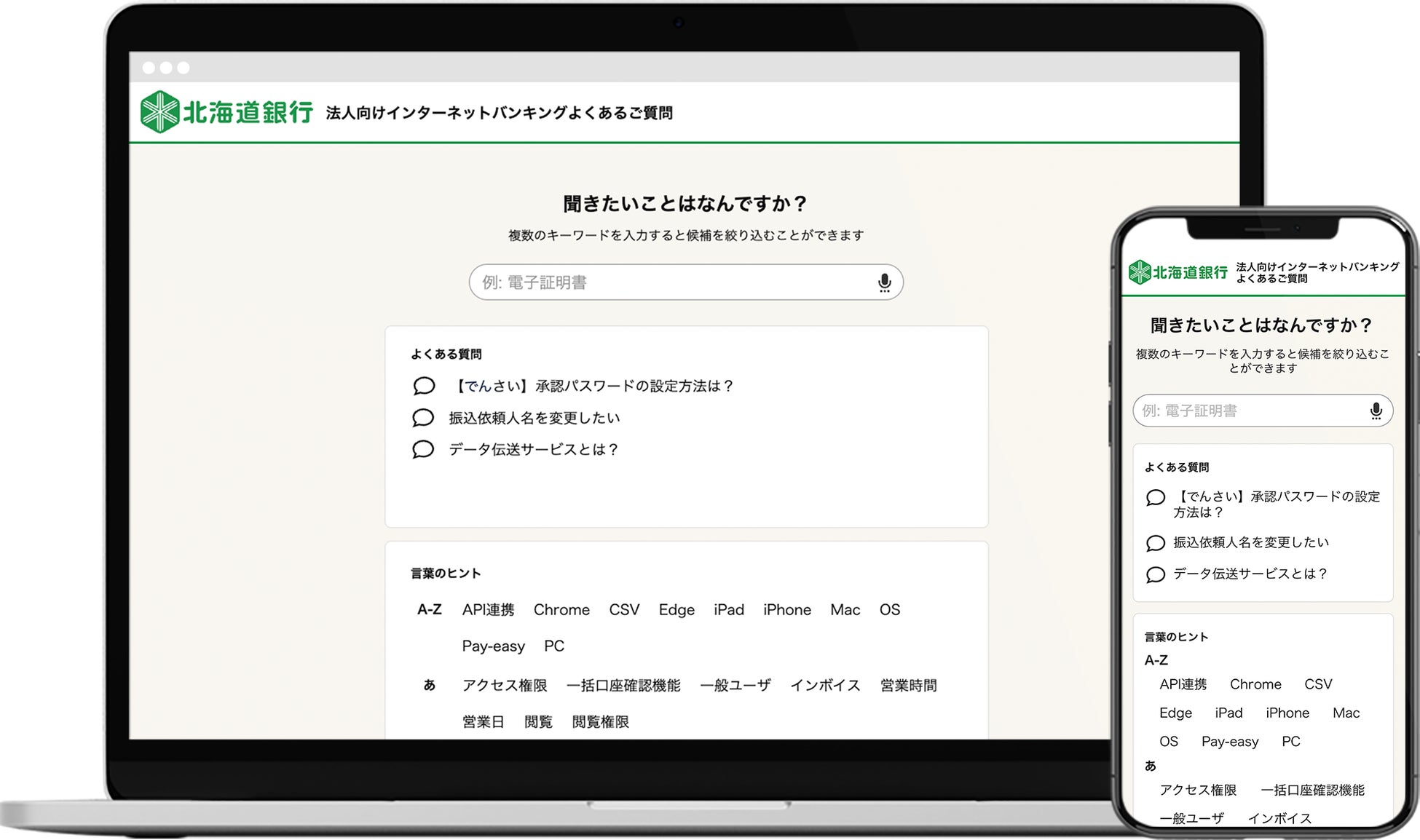 北海道銀行はこの課題に対し、お客様自身が疑問を解消できる環境の整備が急務と考え、法人向けインターネットバンキングのFAQに検索SaaS「Helpfeel」を導入いただきました。