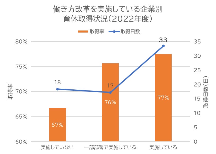 働き方改革の実施と育休取得率・取得日数の関係性を調べました。働き方改革を職場全体で「実施している」と回答した企業は育休平均取得率77%、平均取得日数も33日とともに高い傾向にありました。「一部部署で実施している」と回答した企業は平均取得率は76%と高いものの、平均取得日数は17日に留まりました。育休取得日数は、「職場全体で働き方改革を実施している」と、そうでない企業の約2倍になっています。