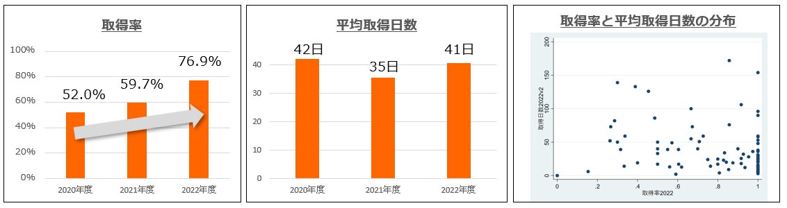 注:取得率、取得日数ともに3年間のデータがある企業・団体のみを集計。有効回答数はそれぞれ92、83。2022年度は回答時点での見込みの数値。