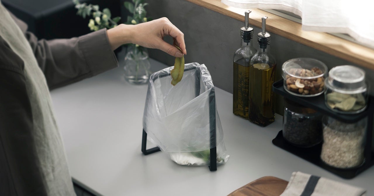 「ポリ袋ホルダー」は、V字のフレームを開くと自立し、ポリ袋をセットするだけでキッチンのゴミ入れとして活用できるアイテムです。セット方法は、ポリ袋を奥から手前にかけるだけ。袋の口が大きく開くため、ゴミをスムーズに捨てられます。フレームの開き具合を調整することで、狭いスペースでも場所を取らずに使用できます。