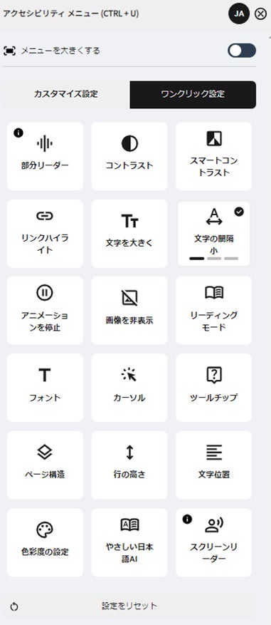 画面左端の車椅子アイコンをクリックすることでメニューが開き、文字サイズや文字間隔の調節、色の反転、彩度やコントラストの調整、クリックした部分の読み上げといったウェブアクセシビリティ対応がご利用いただけます。