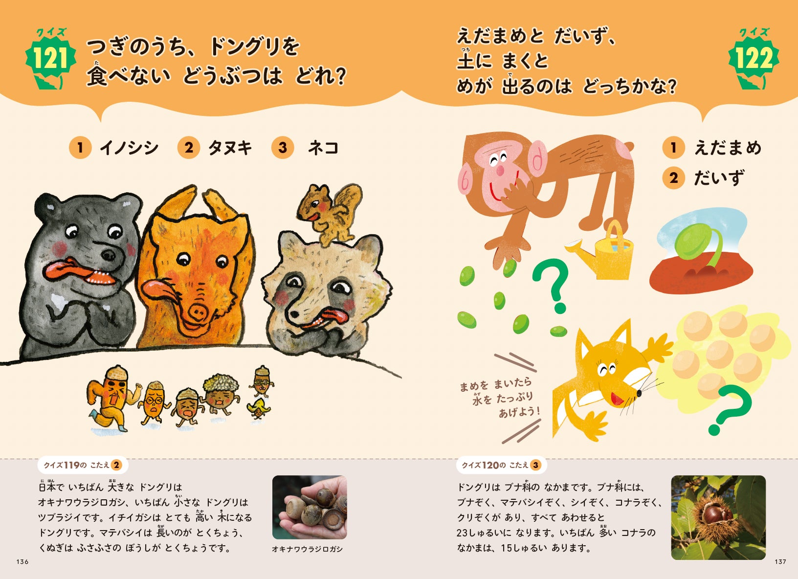 クイズは1ページ1問、合計で300問。すべて「かがくのお話」シリーズの既刊6冊で紹介した科学知識をもとにしたクイズ問題です。シリーズの読者なら「これ、知ってる!」と自信満々に答えられるクイズも多いかもしれません。もちろん、もとの書籍を知らないお子さんも大丈夫。科学オールジャンルからバランスよく出題しており、遊んで答えてくわしい解説文を読むことで、科学の基礎知識と科学への興味がぐんぐんと育つしくみです。