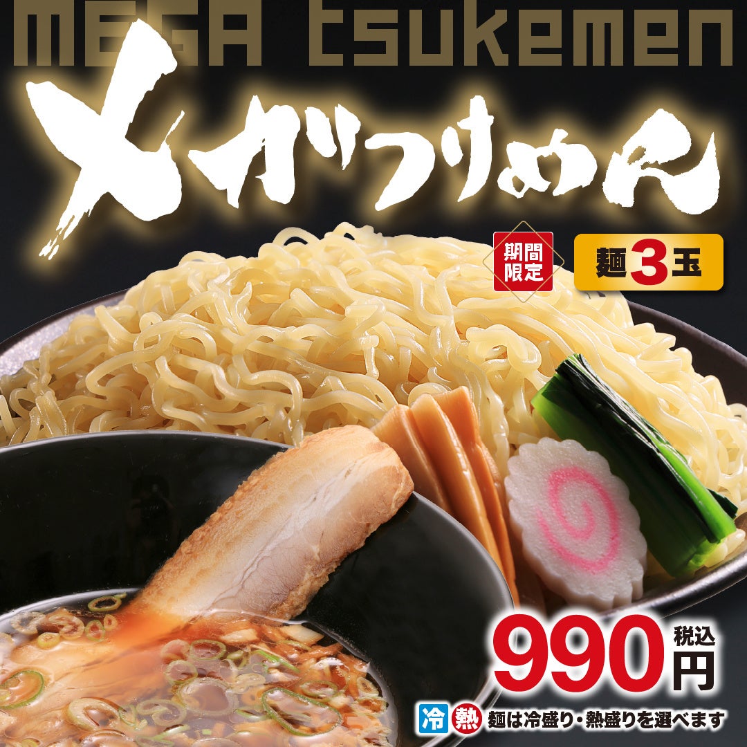 また、同日より、麺量と特製つけダレが通常の2倍(麺3玉)の「メガつけめん」990円(税込)を販売するとともに、時間帯限定「中華ダイニング」各種セットに200円(税込)プラスすることで、80円お得に「餃子」を追加できる「餃子セット」が加わります。