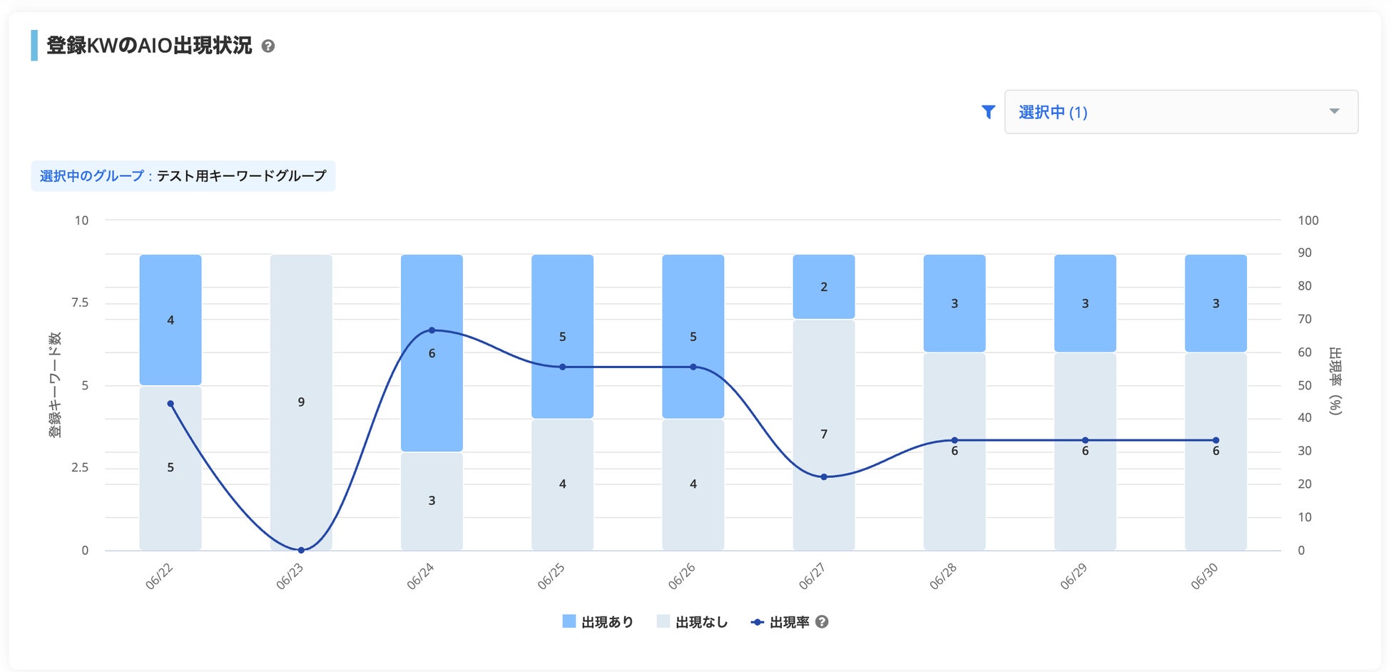 本機能により、登録した検索キーワードにおけるGoogleのAI Overviewsの表示率やその推移を、ひと目で確認できるようになります。