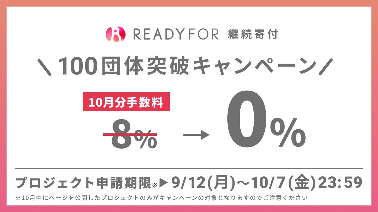 READYFOR株式会社(所在地:東京都千代田区、代表:米良はるか)が運営する「READYFOR 継続寄付サービス」において、導入団体数100団体突破を記念し、継続寄付サービス利用時の10月分の手数料(通常8%)が無料となるキャンペーンを実施いたします。