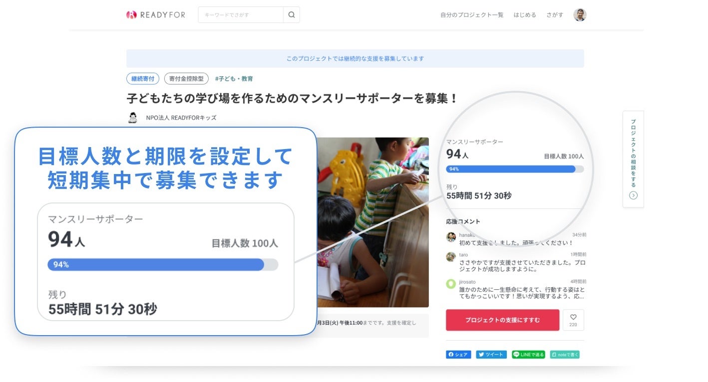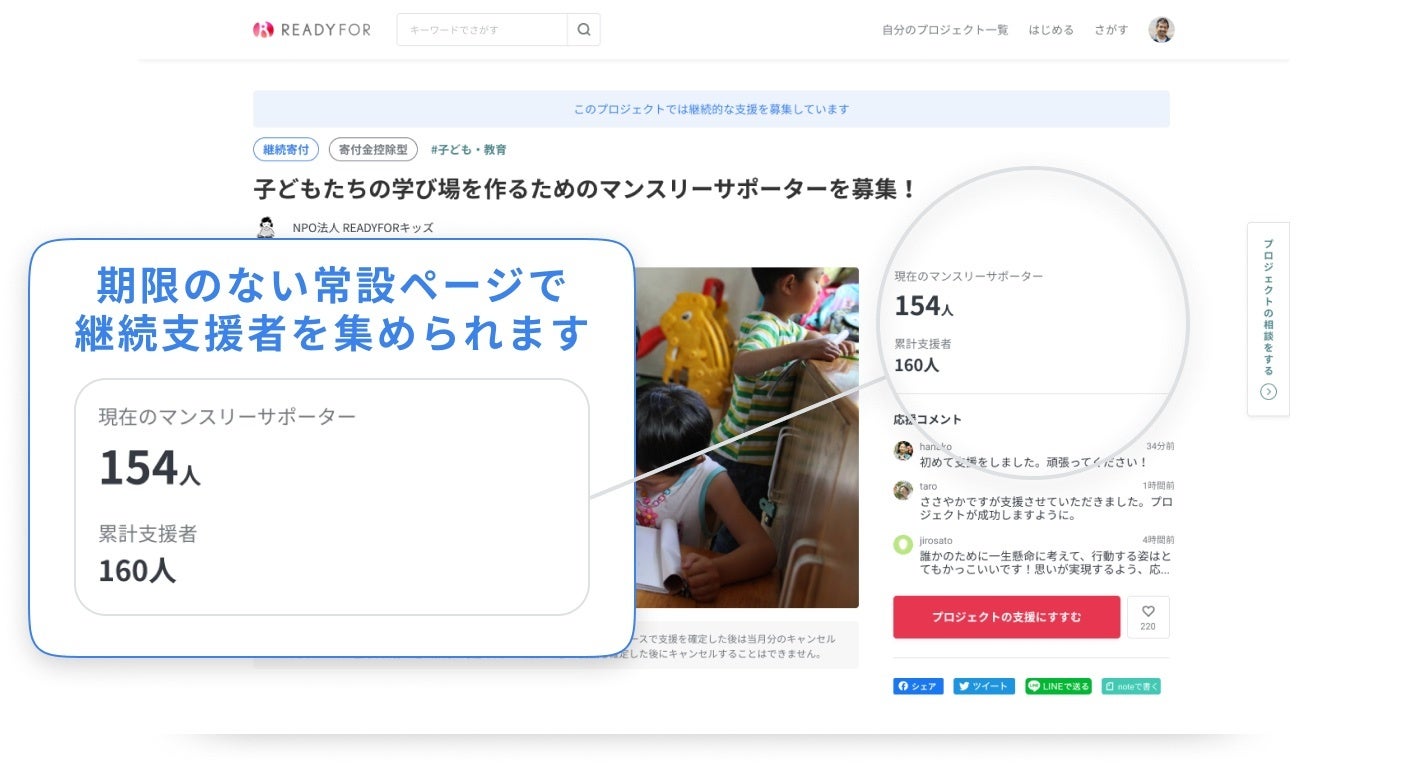 (継続寄付サービス詳細ページURL:https://readyfor.jp/fundraising/)