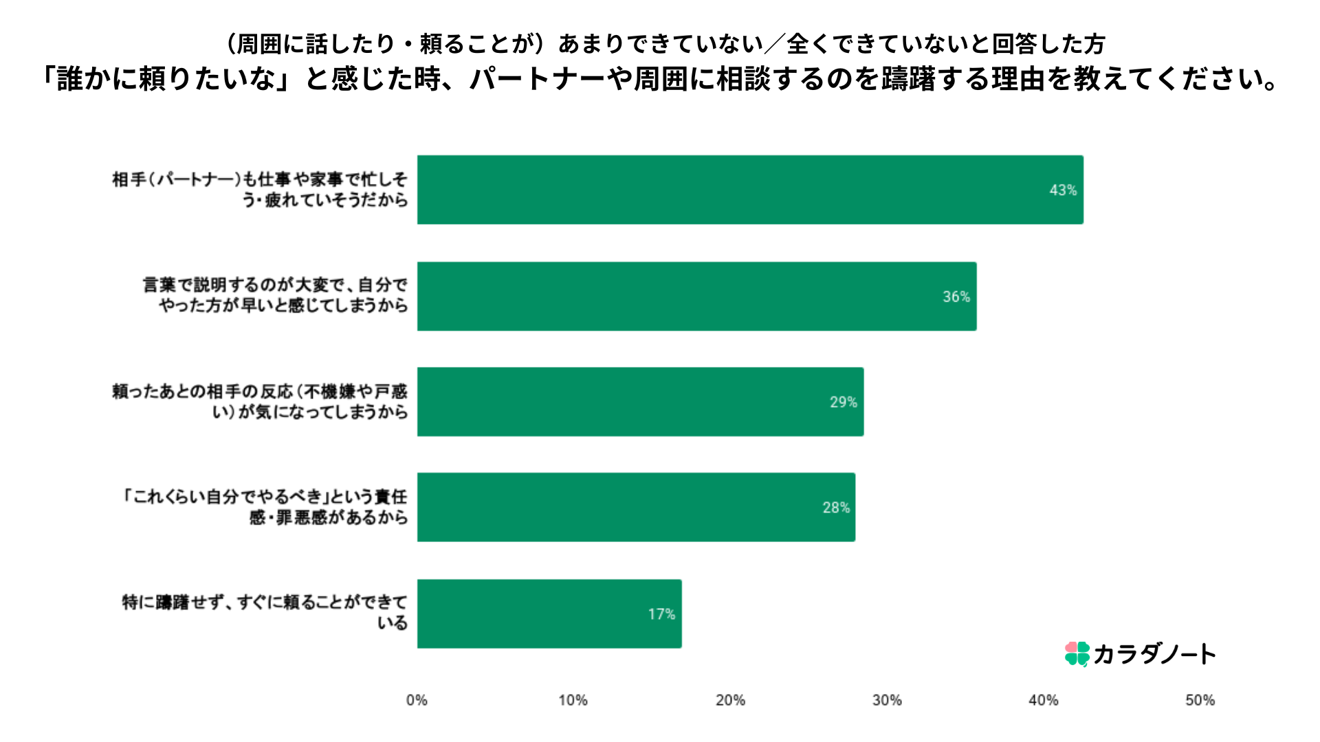 「パートナーも仕事や家事で忙しそう・疲れていそうだから」という回答が最も多く、相手を気遣うあまり、自身のSOSを飲み込んでしまう傾向が見られます。