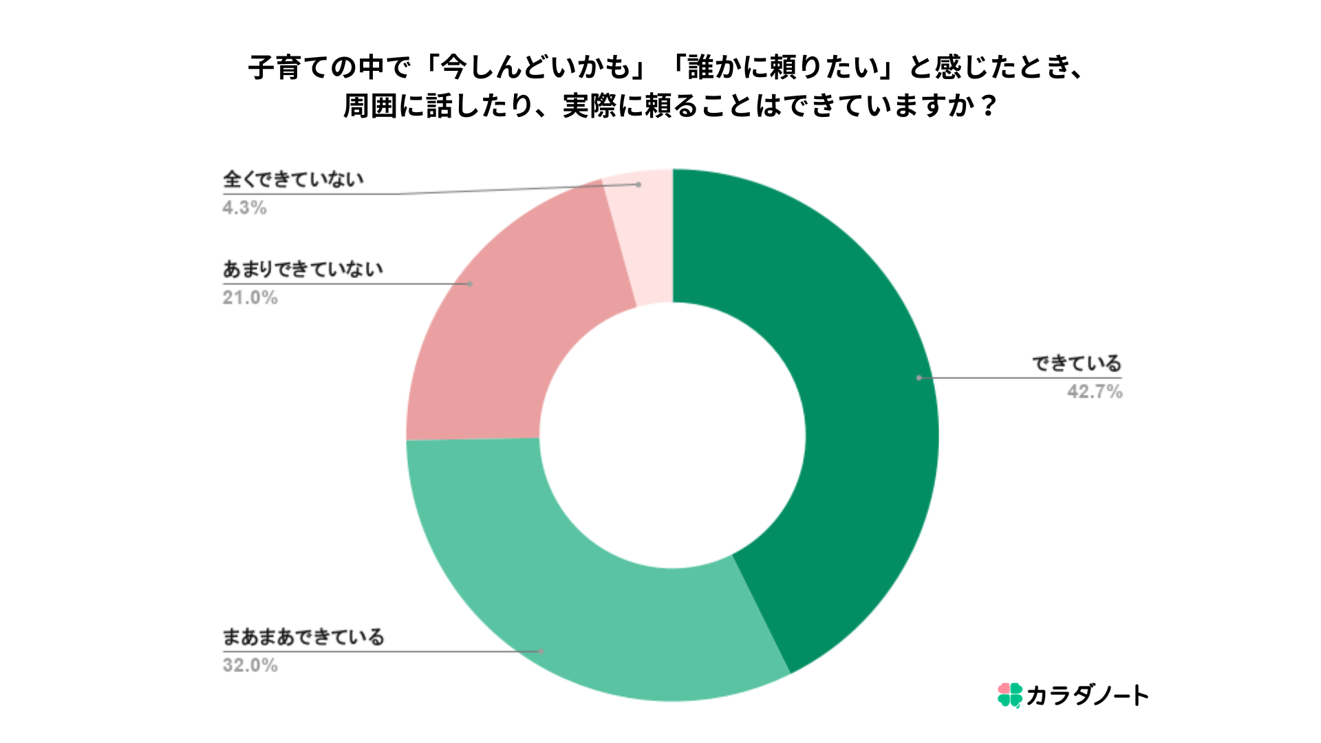 「家族の健康を支え 笑顔をふやす」をビジョンとし、家族と向き合う全ての人の伴走者として心身ともに健康な生活を支援する株式会社カラダノート(東京都港区 / 代表取締役:佐藤 竜也 / 以下当社)は、子育て中の「周囲への頼り方」に関する実態調査を実施しました。