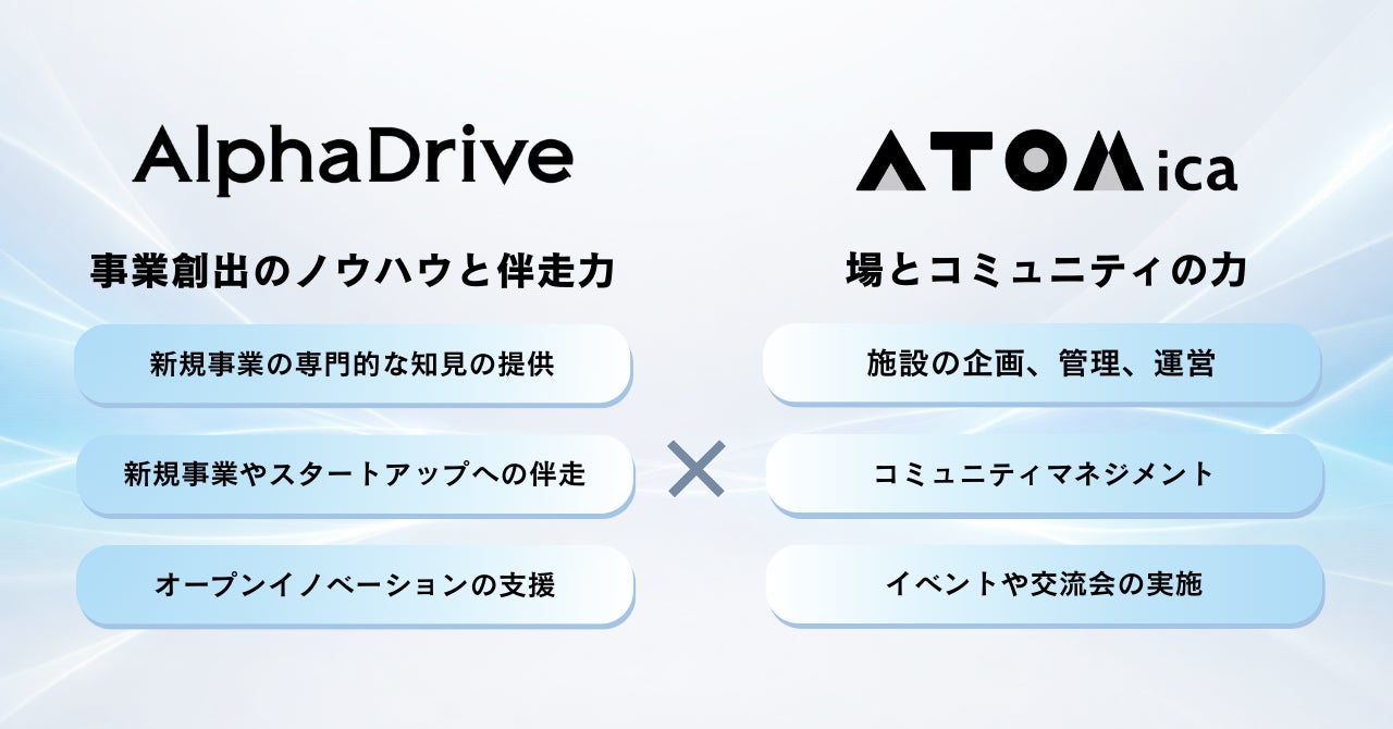 AlphaDriveがATOMicaと連携し、スタートアップ支援施設やオープンイノベーション施設における「場とコミュニティの企画・運営」から「事業創出の支援」まで一気通貫でサービス提供します。