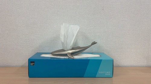 穴の部分にティッシュを通してセットすれば、まるで潮を吹くように、くじらの鼻の穴からティッシュがふわっと飛び出すユーモラスなアイテムとなっています。