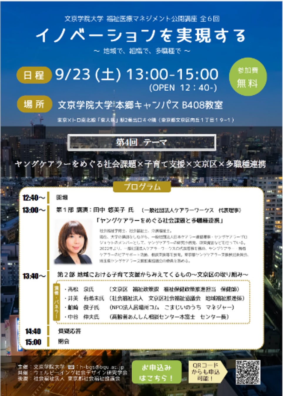 福祉医療マネジメント公開講座「イノベーションを実現する~地域で、組織で、多職種で~」 第4回「ヤングケアラーをめぐる社会課題×子育て支援×文京区×多職種連携」開催