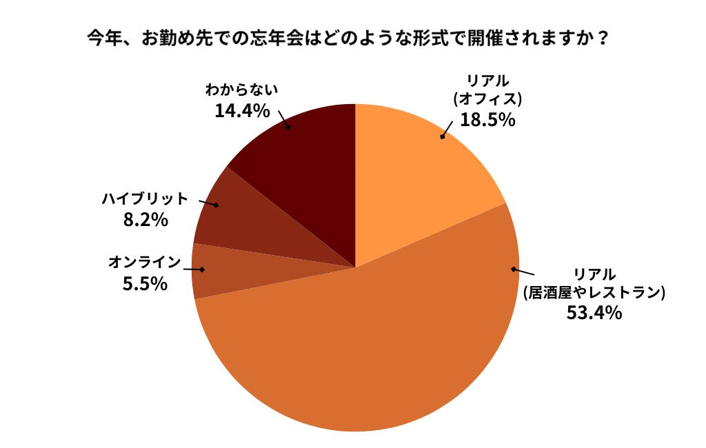 開催形式は「オンライン開催」5.5%、「ハイブリッド開催」8.2%と、一定数いるものの大多数の71.9%は「リアル開催」でした。「リアル開催」の内訳として「オフィス」が18.5%、「レストランや居酒屋」は53.4%でした。