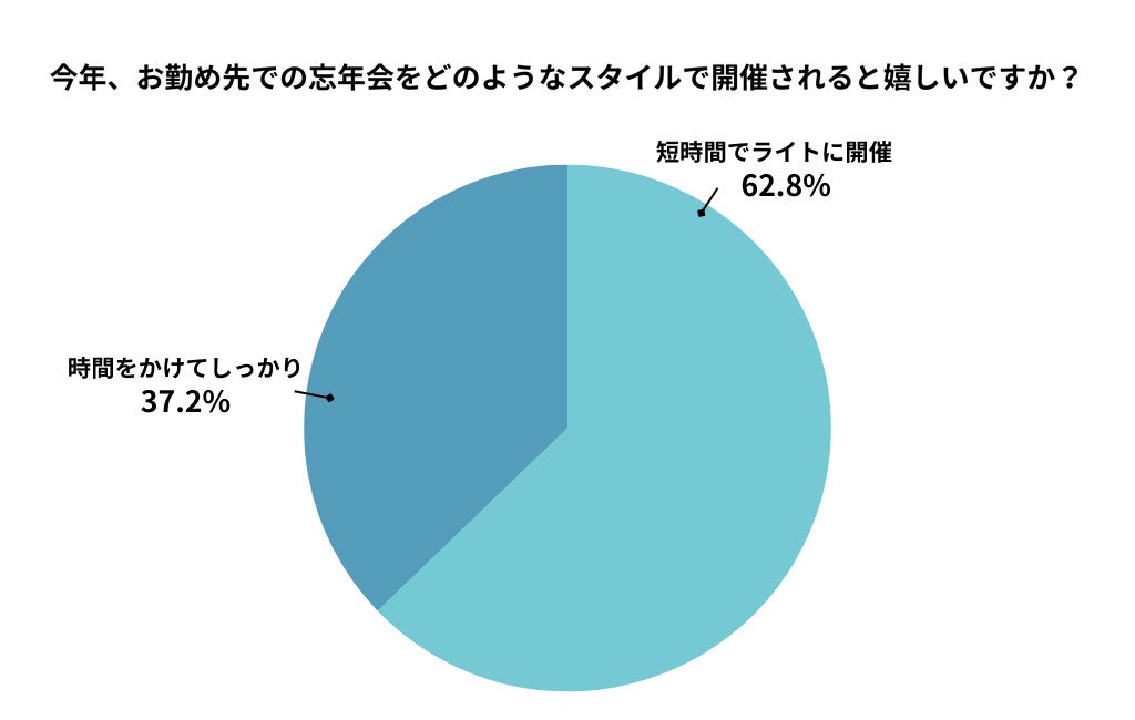 実際に開催される忘年会のスタイルと参加者の立場として希望する忘年会のスタイルについて、「短時間でライトに交流できればいい」が37.2%「時間をかけてしっかり交流できた方がいい」62.8%