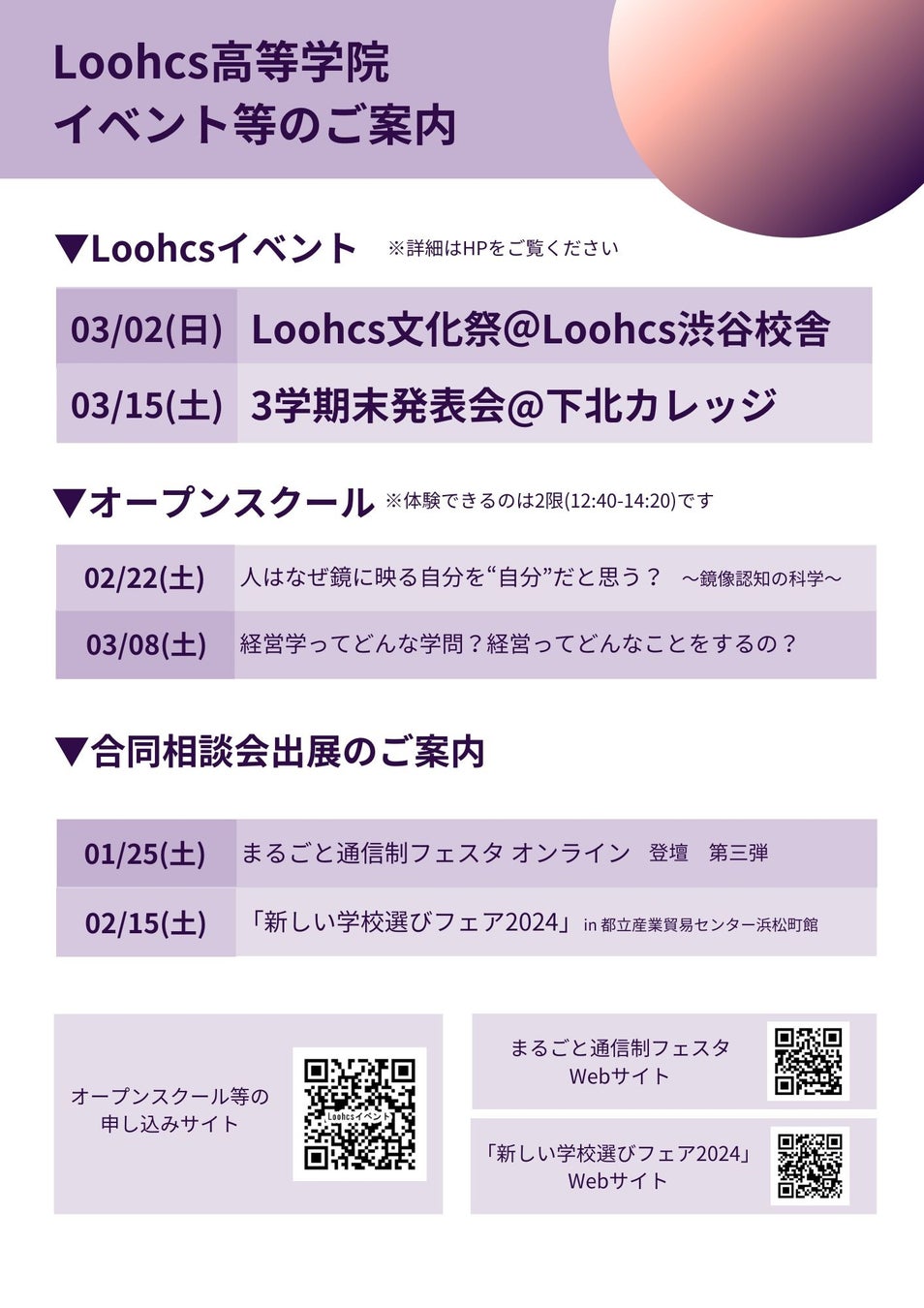 Loohcs高等学院では、1月から3月にかけて、多彩なイベントを開催いたします。学生が主体となって行うLoohcs文化祭やリベラルアーツ教育を体験することができるオープンスクールなど、Loohcsの魅力が詰まったイベントを予定しています。ぜひこの機会にご参加ください。