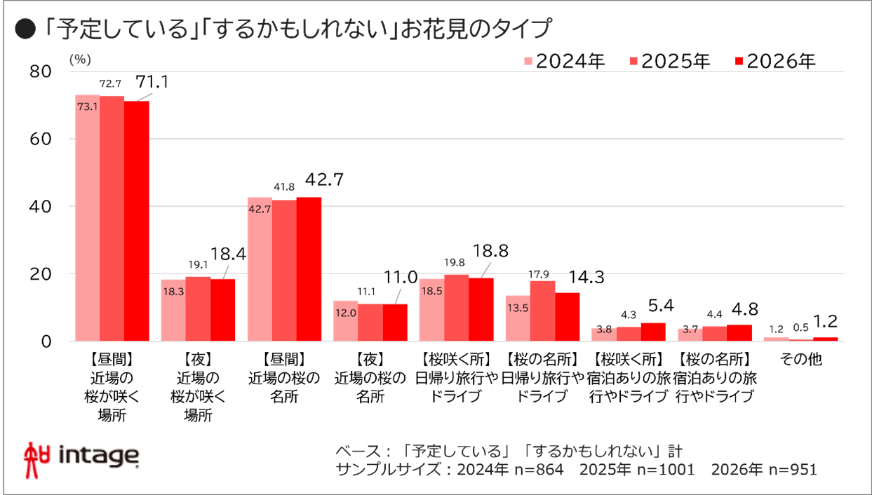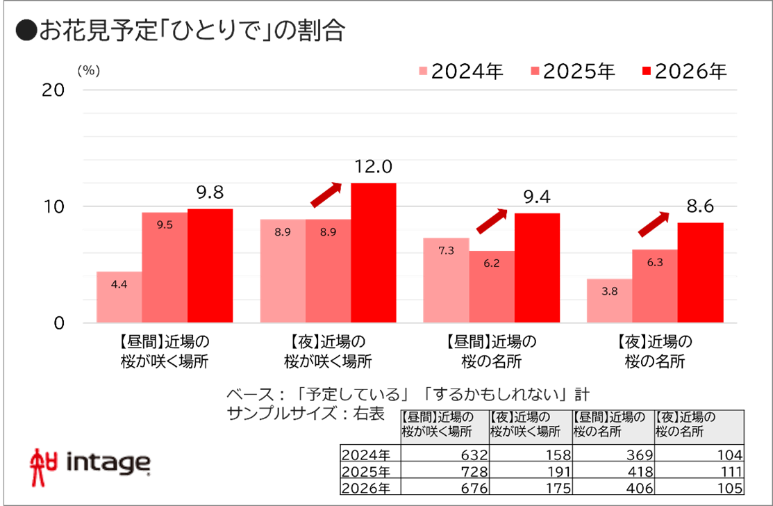 さらに今年は、“ソロ(ひとり)花見”の広がりも注目されます。調査結果からは、昼・夜ともに「近場でひとり」を選ぶ人の割合が昨年から上昇。中でも、夜の近場スポットでは12.0%(前年比1.3倍)と、3年間で最も高い値となりました。
