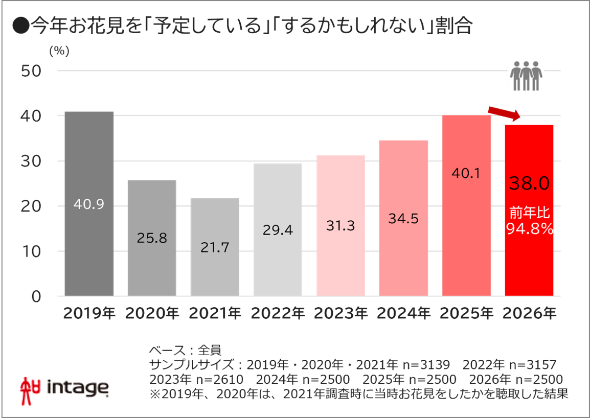 ・2026年の花見予定率は38.0%で、昨年から2.1ポイント減少。前年比94.8%となった