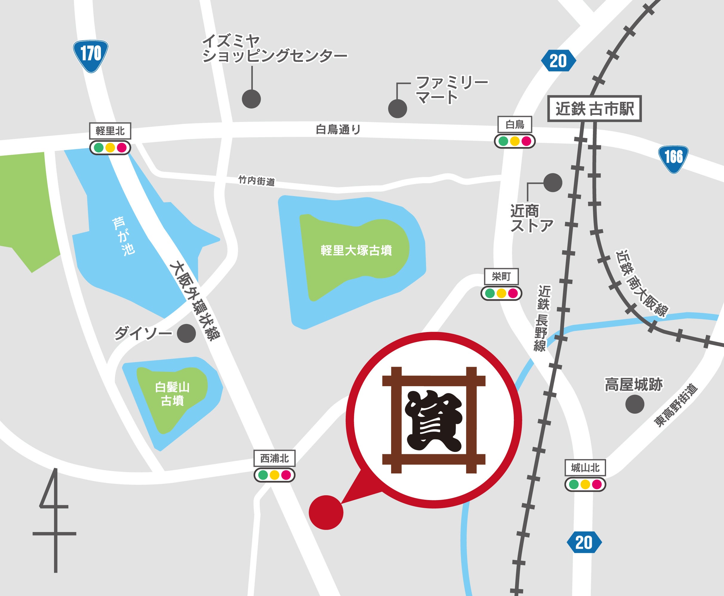 「資さんうどん羽曳野店」は、国道170号線沿いに位置し、お車でのご来店が大変便利です。近鉄南大阪線「古市駅」からは車で約7分、「藤井寺IC」からも約10分圏内で、府内各方面からアクセスしやすい立地です。また、店舗周辺にはスーパーや飲食店など生活利便施設が集まっており、買い物やお出かけの合間にも立ち寄りやすい環境です。地域の方はもちろん、ドライバーの方やご家族連れにもご利用いただきやすい店舗です。
