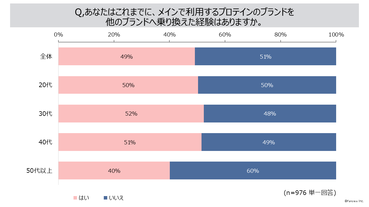 1. プロテインブランドの乗り換え経験が「ある」49%、乗り換えた理由は「味が気に入らない」